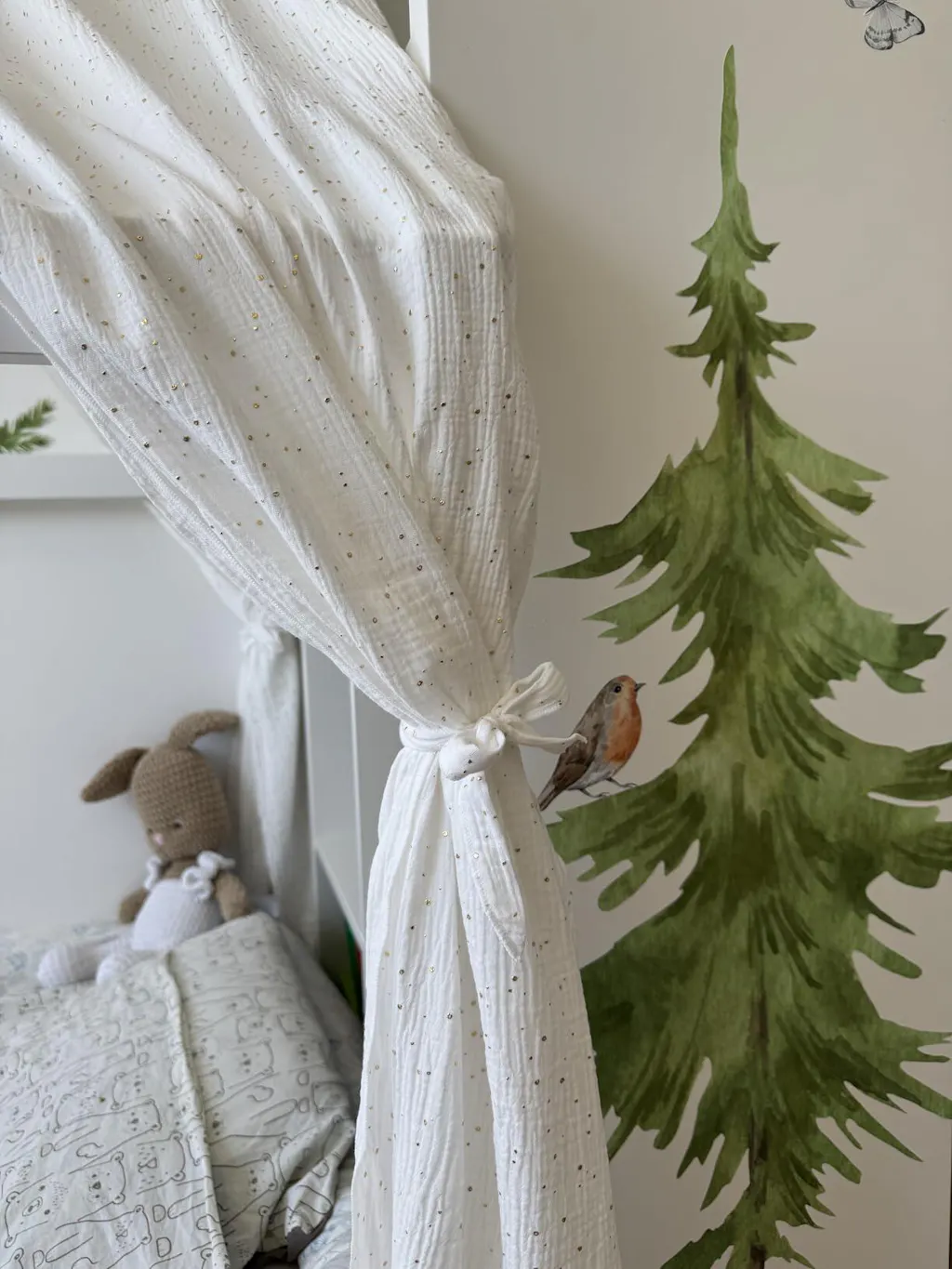 Der Lilimaus Hausbett Himmel (2er Set) verwandelt jedes Kinderbett in einen zauberhaften Rückzugsort. Gefertigt aus 100% natürlicher Musselin-Baumwolle, bietet er eine weiche und atmungsaktive Umgebung, die zum Träumen und Entspannen einlädt. Die charakteristische Musselin-Textur verleiht dem Kinderzimmer ein gemütliches und stilvolles Ambiente. Dank der einfachen Montage ist der Betthimmel im Handumdrehen angebracht und setzt elegante Akzente im Raum.